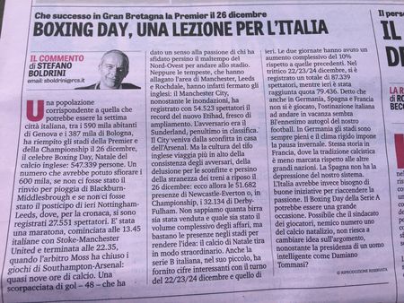 Nuovo articolo, pubblicato sul principale quotidiano sportivo italiano, in cui si parla di affluenze, di presenze negli stadi dei tifosi. L’articolo, a questo giro, focalizza l’attenzione sul periodo delle feste. Il contenuto dell’articolo lo potete leggere qui di seguito. In sostanza: in Italia abbiamo la pausa di campionato per le feste natalizie, in Inghilterra giocano e gli stadi sono stracolmi di tifosi. Perché non giochiamo anche noi a natale? Il passaggio che però vogliamo mettere sotto la lente di ingradimento è verso la fine dell’articolo, e recita: “L’Italia avrebbe bisogno invece di buone iniziative per riaccendere la passione. Il Boxing Day della Serie A potrebbe essere una grande occasione”. Giocare a Natale e durante le feste? Ognuno può vederla a modo suo. Quel che però vogliamo far notare è come ancora una volta (riecco la vera “ostinazione italiana”) si guarda all’estero per trovare la soluzione al nostro problema. Ancora una volta, invece di ragionare sulla criticità e cercare di trovare la cura, si guarda in casa di altri (la strada come sempre più veloce e semplice ma non necessariamente la più intelligente). La gente in Italia non va più allo stadio, abbiamo il tasso di riempimento degli stadi che risulta essere fra i più bassi d’Europa, e questi sono dati di fatto. Abbiamo, tra le altre cose, le procedure più complicate d’Europa per acquistare un biglietto (il concetto di “tessera del tifoso”, ad esempio, all’estero non esiste, con il suo contorno di moduli, permessi, etc). Perché allora non provare a semplificare le procedure di acquisto dei tagliandi? Perché non rendere la vita più semplice ai tifosi italiani? Vogliamo veramente risolvere il problema? Bene, allora partiamo dalla base. L’Italia ha bisogno di buone iniziative per riaccendere la passione? Chissà, forse basterebbe rendere tutto più semplice al tifoso che non chiede altro che andare allo stadio per vedere la propria squadra. E, perchè no, rendere i prezzi dei biglietti stessi accessibili a tutte le tasche, soprattutto per quel che riguarda i settori popolari. In altre parole, cose (per l’appunto) semplici. Basta poco, basta volerlo.