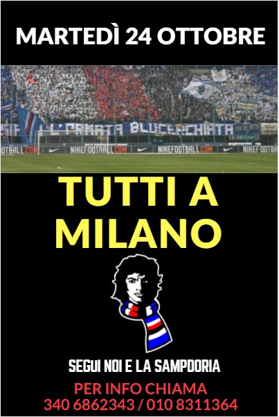 Dopo la bella vittoria di ieri, oltre alla gara di Sabato prossimo col Crotone, è tempo di prepararsi alla prossima trasferta. E allora, cuore caldo e testa a lei. Martedì 24 Ottobre, ore 20:45, Stadio “Giuseppe Meazza” di Milano. Riempiamo il settore, portiamo con fierezza i nostri colori…come in quegli anni in cui tutto era facile! Avanti Sampdoriani, tutti in trasferta!