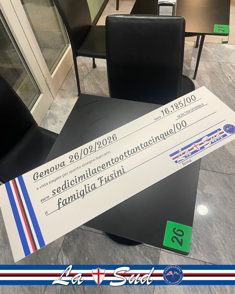 Come di consueto, a conclusione della raccolta benefica per Antonio Fusini, condividiamo con la solita trasparenza a tutti i tifosi sampdoriani la cifra finale raggiunta di 16.185 € (Sedicimilacentoottantacinque/00 euro). Totale che è già stato interamente devoluto alla famiglia.