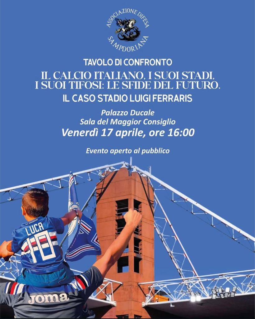 Questo tavolo di confronto avverrà VENERDÌ 17 APRILE alle ore 16:00 nella Sala del Maggior Consiglio a PALAZZO DUCALE e si chiamerà “IL CALCIO ITALIANO, I SUOI STADI, I SUOI TIFOSI: LE SFIDE DEL FUTURO. Il caso Stadio Luigi Ferraris”, come a riprendere uno dei punti della petizione nazionale, il quinto per l’esattezza, “stadi a misura di tifoso”.